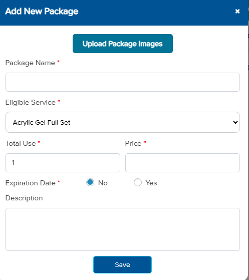 Create New Package – In the Appointment Packages section, select Package Settings. – Click New Package to create a package. – Fill in all package information, then click Save. After creating the package, you can edit or delete it in the package management table below.