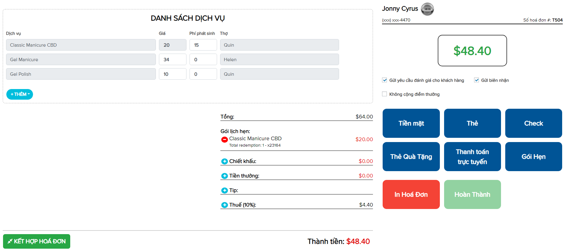 + Hiển thị tên dịch vụ được trừ, số tiền được giảm.