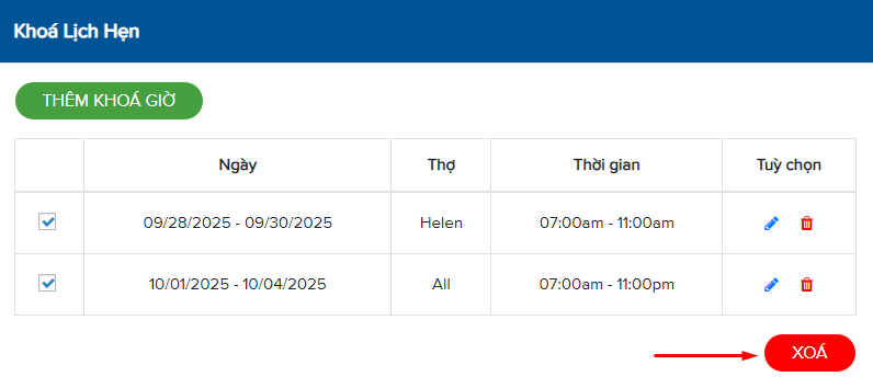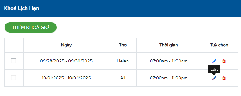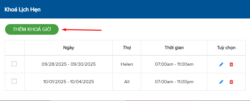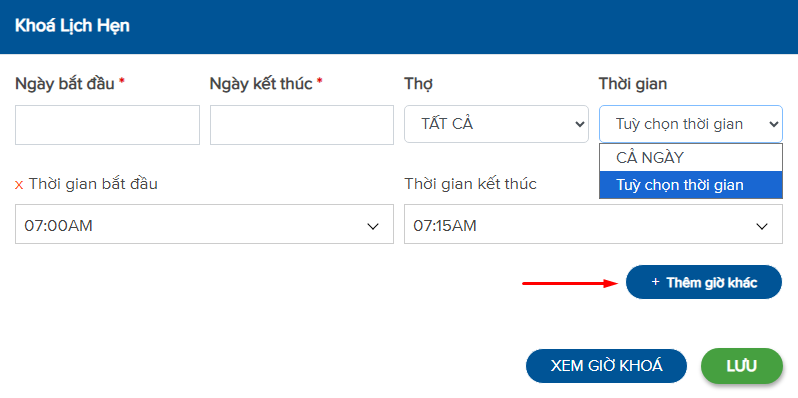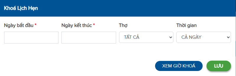 + Thợ: Nếu muốn khóa lịch cho tất cả thợ thì chọn Tất cả. Hệ thống mặc định sẽ chọn Tất cả.