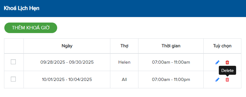Khóa giờ hẹn trực tuyến cho phép khoá khung giờ theo ngày đã chọn, đảm bảo khách hàng không thể đặt lịch hẹn online vào khung giờ đã cài đặt.